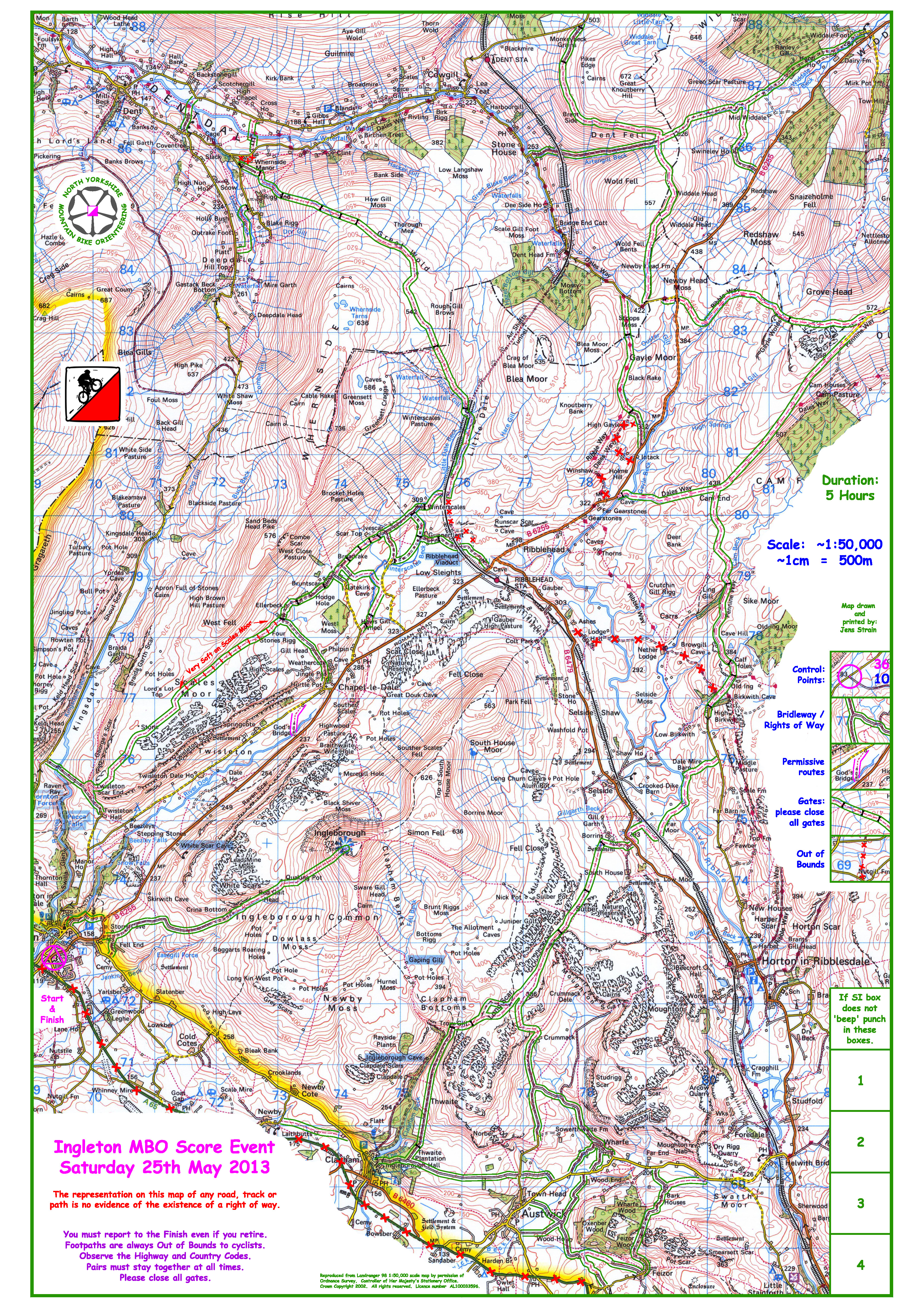 Ingleton was my first attempt at course planning & in 5 hours one can cover a lot of ground. I didn’t want a clear up but I did want plenty of route choice. When we put out the controls on Friday afternoon it was hell & high water but when I awoke at Ribblehead on Saturday morning all was calm & sunny. I arrived at the event centre at 9am & a steady stream of riders was hitting the start dibber from 10am onwards. Shortly after 11 o’clock all competitors were out on the course.