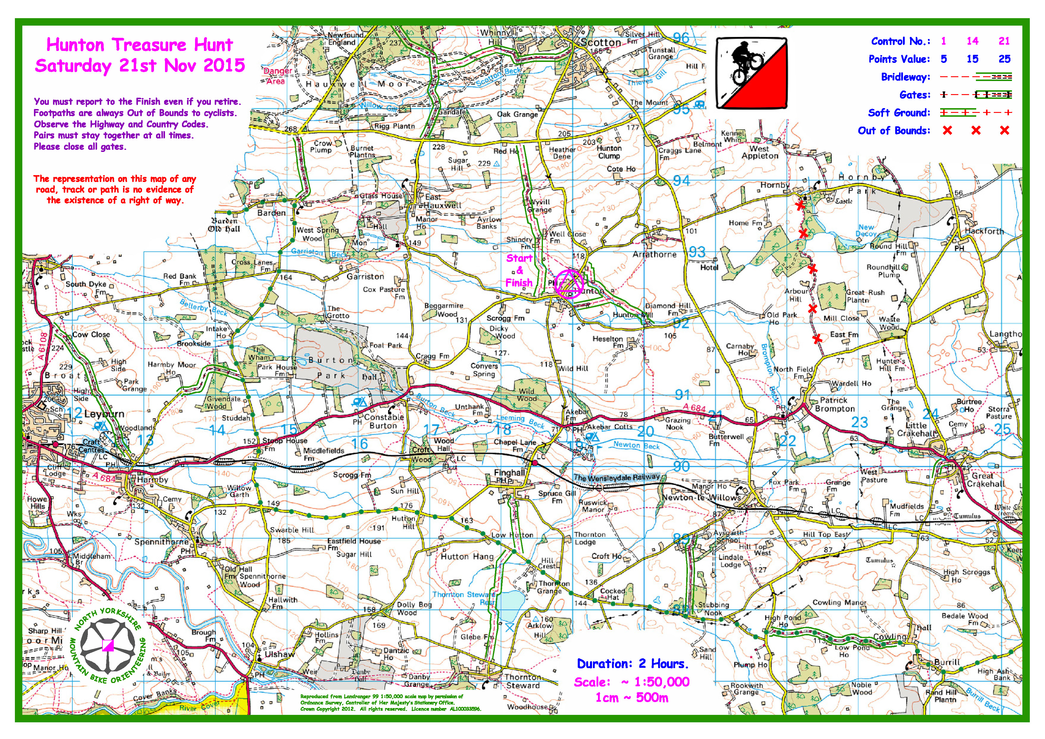 As you can see, there aren’t many bridleways on the map but plenty of quiet country lanes which is just as well considering the recent wet weather. All types of bikes are welcome but you will need a mountain bike to get to 6 of the controls. We have only got 20 pre-entries. Online entries close at midnight on Wednesday so that Jens can print enough maps and 10 spare for entry on the day. It’s just started raining yet again but the forecast for Saturday is cool but dry with sunny intervals although there will be a 15 mph northerly wind so bring plenty of kit. Hope to see you there.