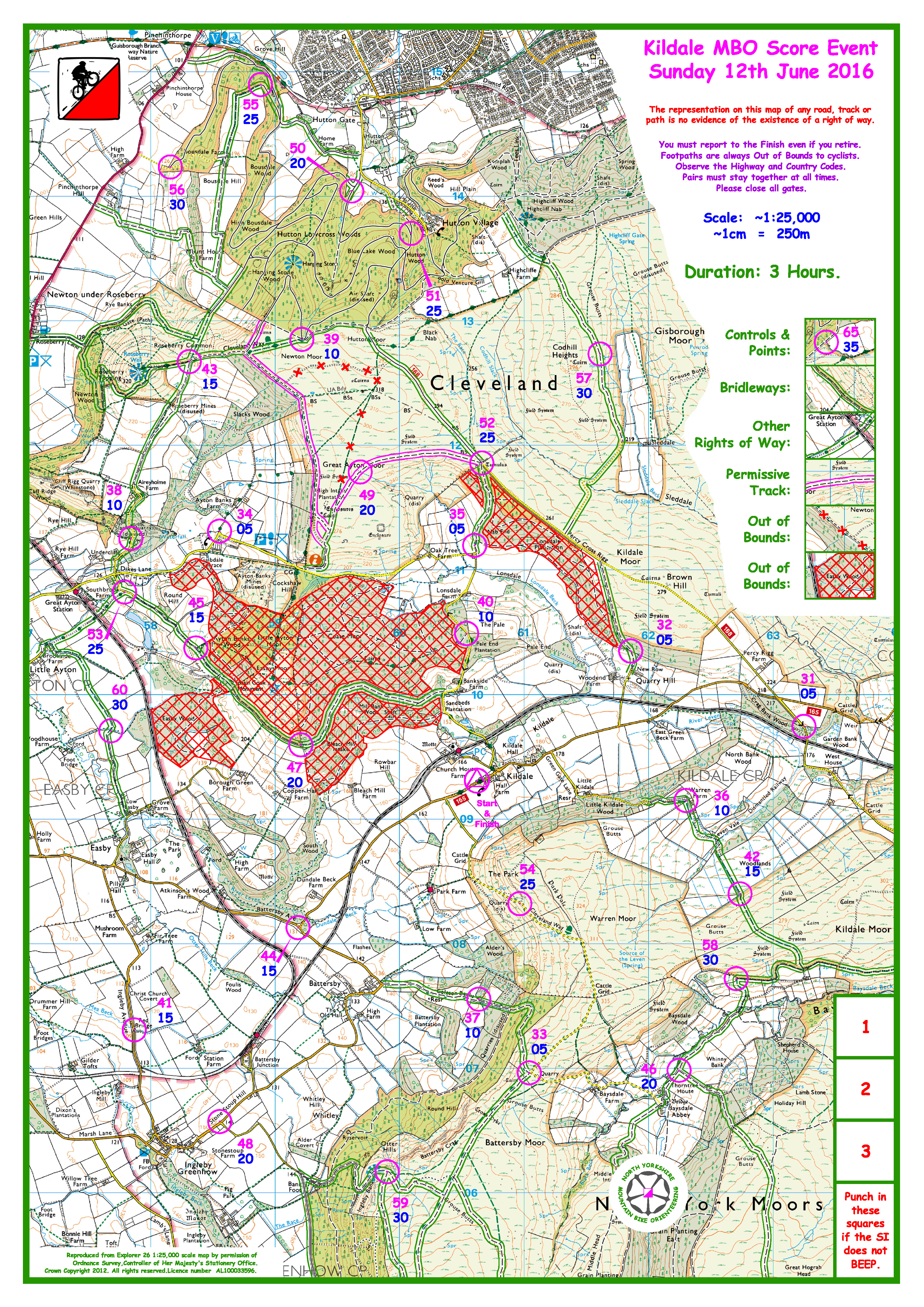 Thanks to Conrad & Jill for yet another excellent course. It was a pity that it has been so wet recently but at least it stopped raining by the time most riders had started and the sun shone for the control collectors. Congratulations to Andrew Windrum on an excellent score after a very tiring day putting out and collecting 54 controls for the York MTBO events on Saturday. Karen Clark was the leading lady and Steve & Andrea first mixed team ahead of Tony & Angela who rode together. I enjoyed my ride despite the lack of views but should have gone to Hutton Lowcross for the high scoring controls rather than Baysdale which was rather tough.