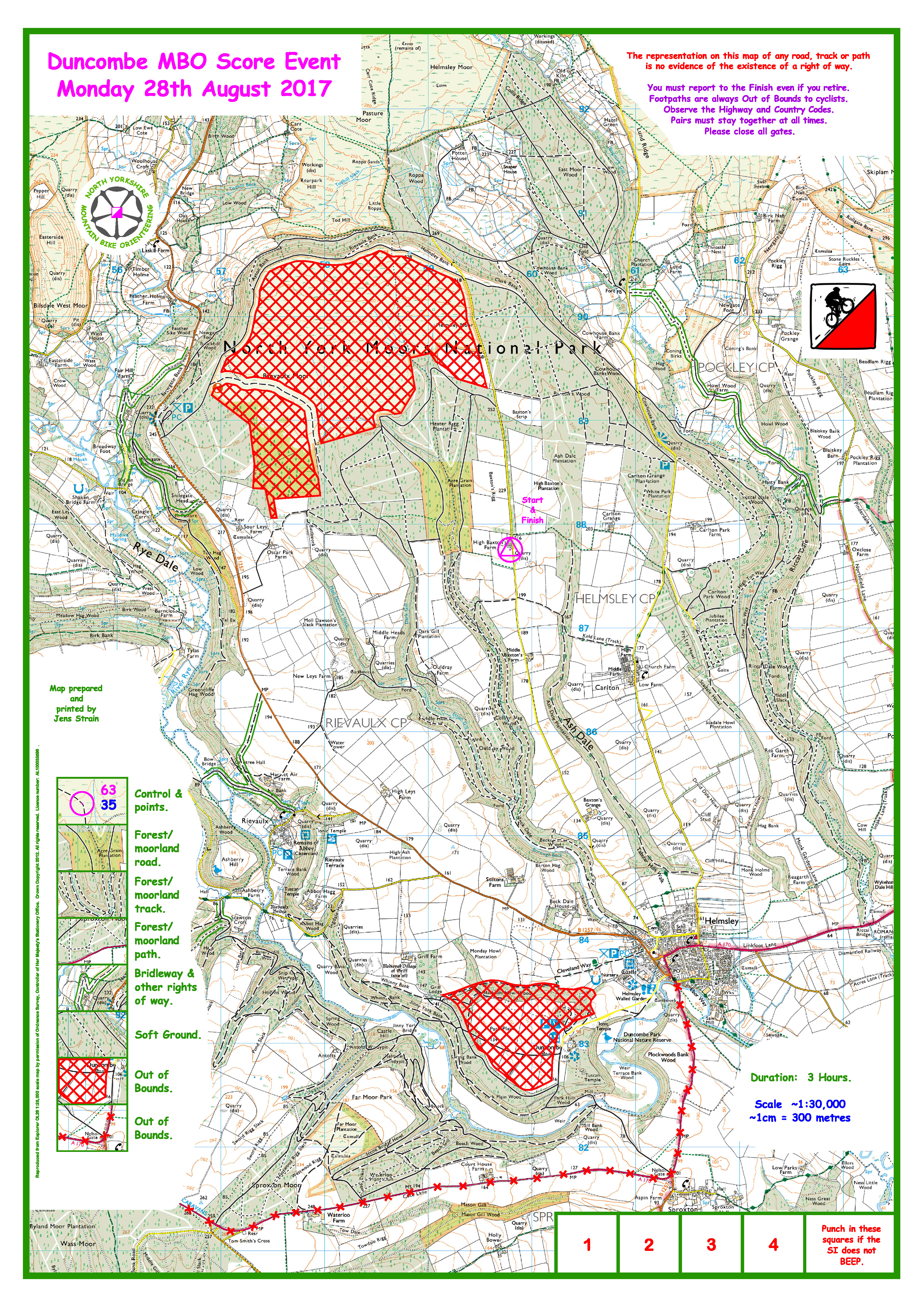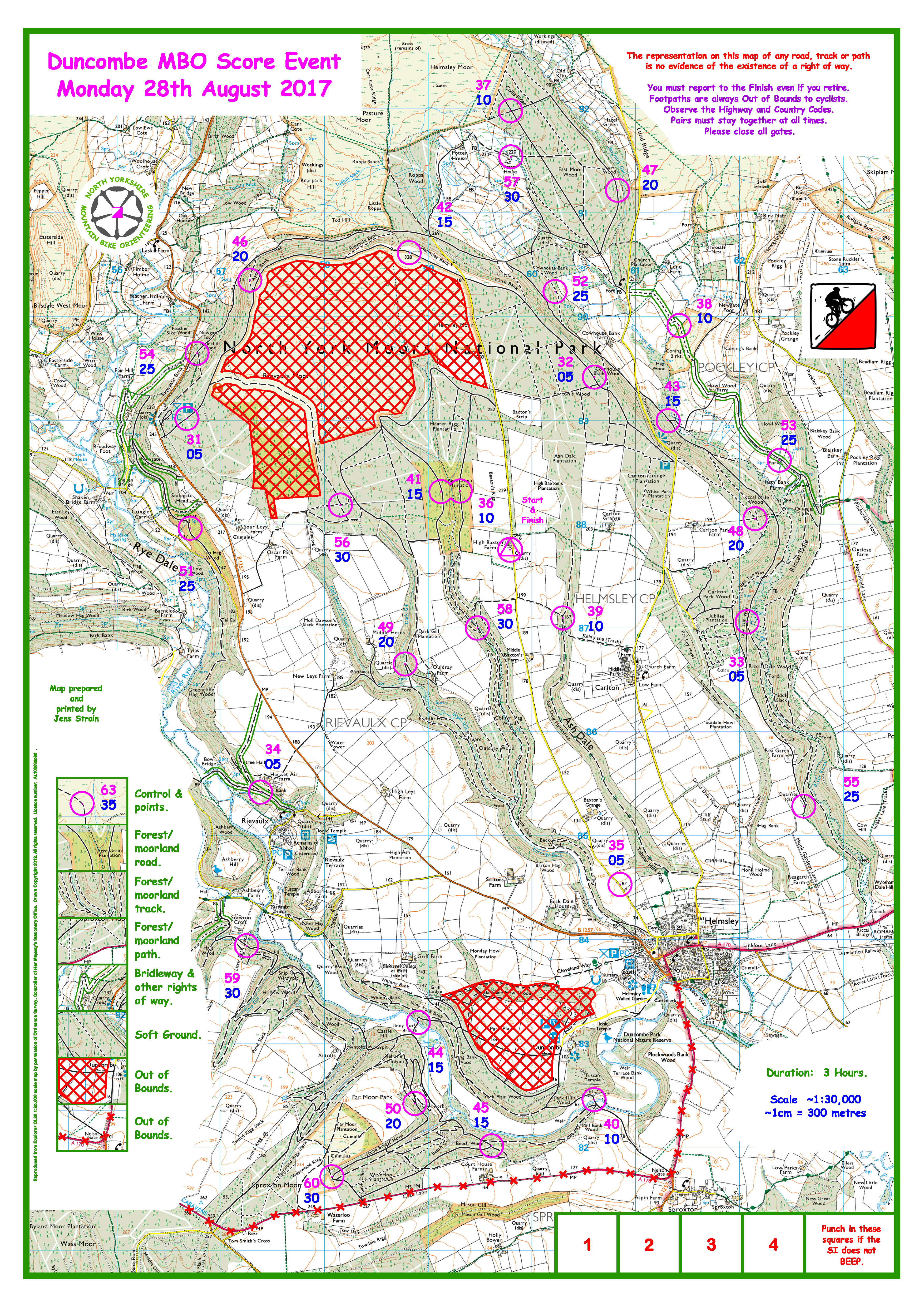 I very much enjoyed planning this event. When I planned it in May we were going to be allowed to cycle past Duncombe Hall but late on Thursday the agent changed his mind so I had to move a control, resulting in Jens having to redraw the map. If this hadn’t happened I am sure one of the riders would have got all the points. The feedback from finishers was very positive & I think most people enjoyed themselves which was also helped by the good weather and reasonable track conditions.