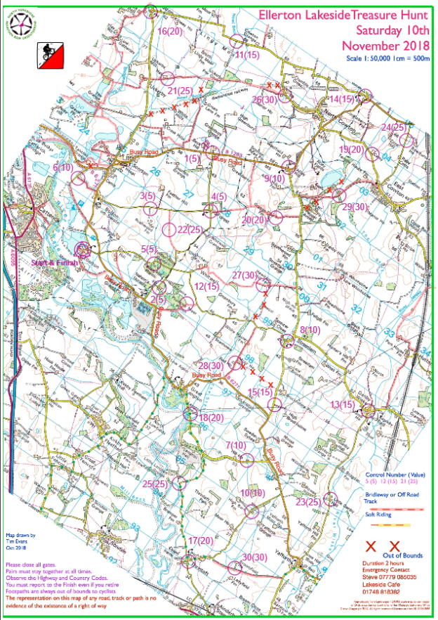 I would like to apologise for the map. Not the 45 degree tilt which worked but because I printed the all controls map instead of the course map so you didn’t have the values and the numbers were too small. This was my mistake, not Tim’s. I’ll post the one you should have had on the web page!! As always I thoroughly enjoyed checking out the bridleways and controls from the Lakeside café which made an excellent event centre. Congratulations to the other category winners Zac & Richard Hutchinson (Gen), John Rawden (Vets) and Karen Blackburn (Ladies).