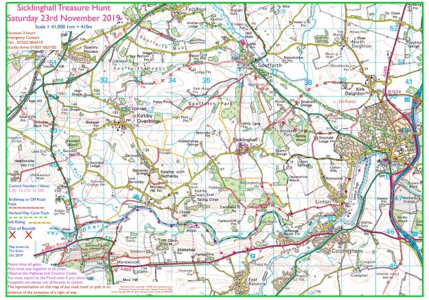 33 brave souls turned out in ‘heavy drizzle’ to brave the roads and tracks around the Scotts Arms at Sicklinghall. It is over 4 years since we last started at this location and now that the Bridges over the river are open I reinstated a few controls south of the river and in doing so made use of the excellent Muddy boots cafe at Harewood on one of the sighting trips. The event 4 years ago had high scores of 450 and given the weather and the restrictions on routes around the centre I think the slightly larger area worked. Given the amount of rain we have had over the last few months I was surprised it was only one or two tracks had gone from rideable to soft and one of these was due to Christmas tree harvesting.