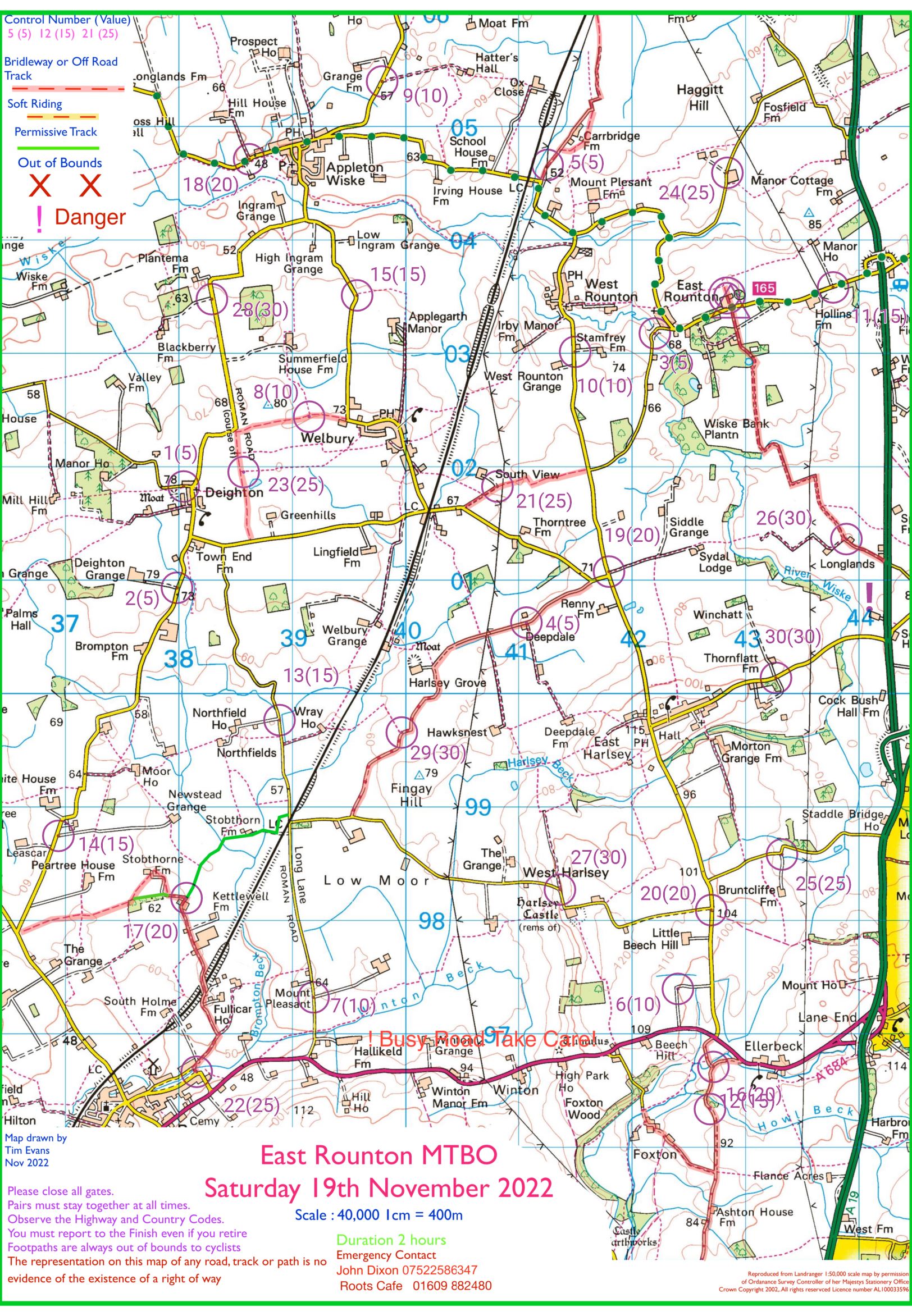 One minor technical map run item. At the BMBO AGM there were complaints that you could just ride with maprun and not do any fine navigation . The more astute of you noticed that control 20 wasn’t exactly at the road junction but on the bridleway junction on the other side of the road slightly south, the control descriptions also made this clear. If the app doesn’t register always check the map and the control description . Nuno might also suggest you turn off other notifications after his early turn round at Gilling .