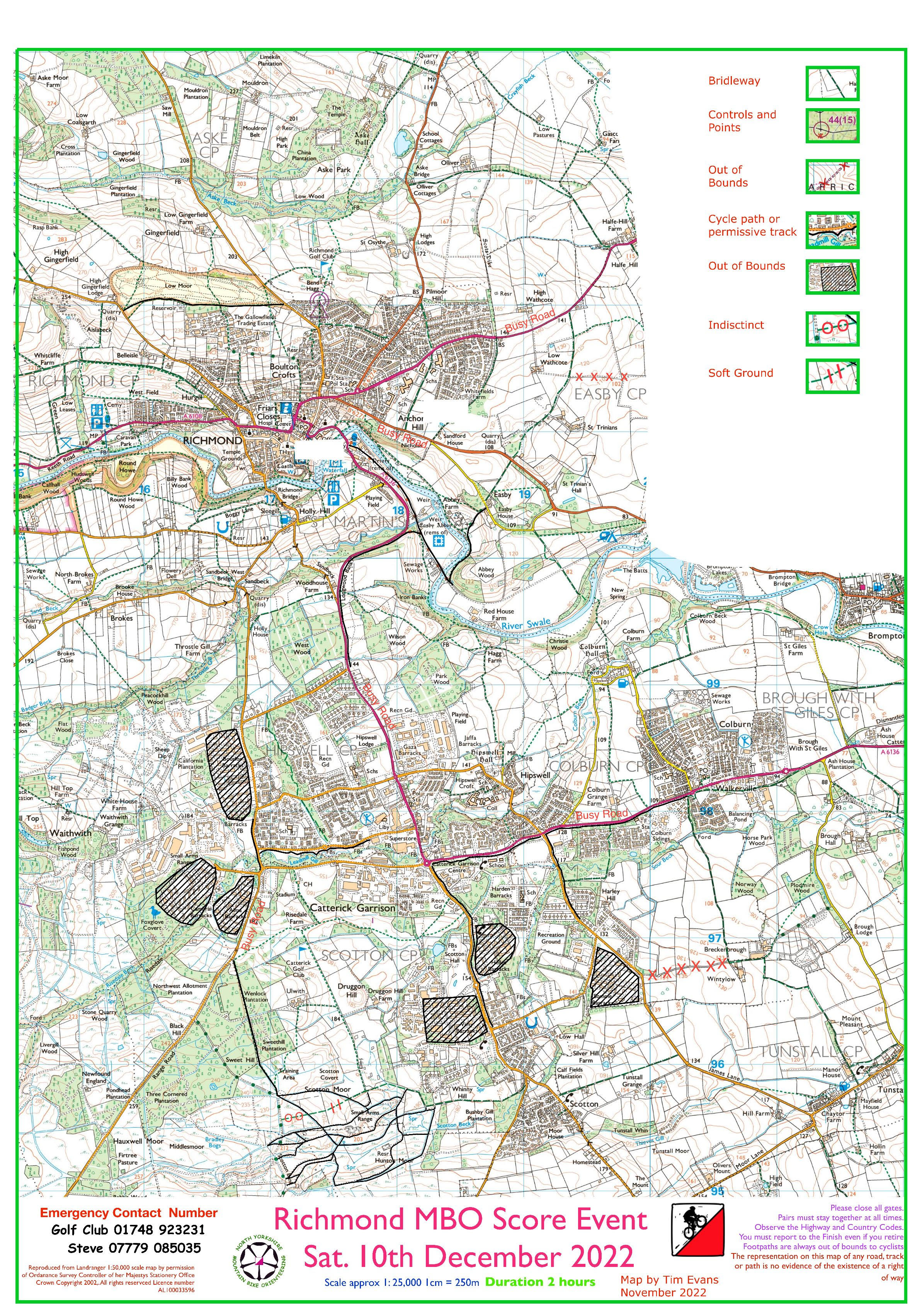 Hopefully, most of you rode the excellent track through the woods to visit 19 and 29 (sorry about the fallen tree) as well as the bridleway across Scotton Moor between 24 and 28. A few hardy souls braved the ford at 10 in Colburn village and everyone found the final climb back up to the golf club rather tough. (I have to do this regularly to get home)!!