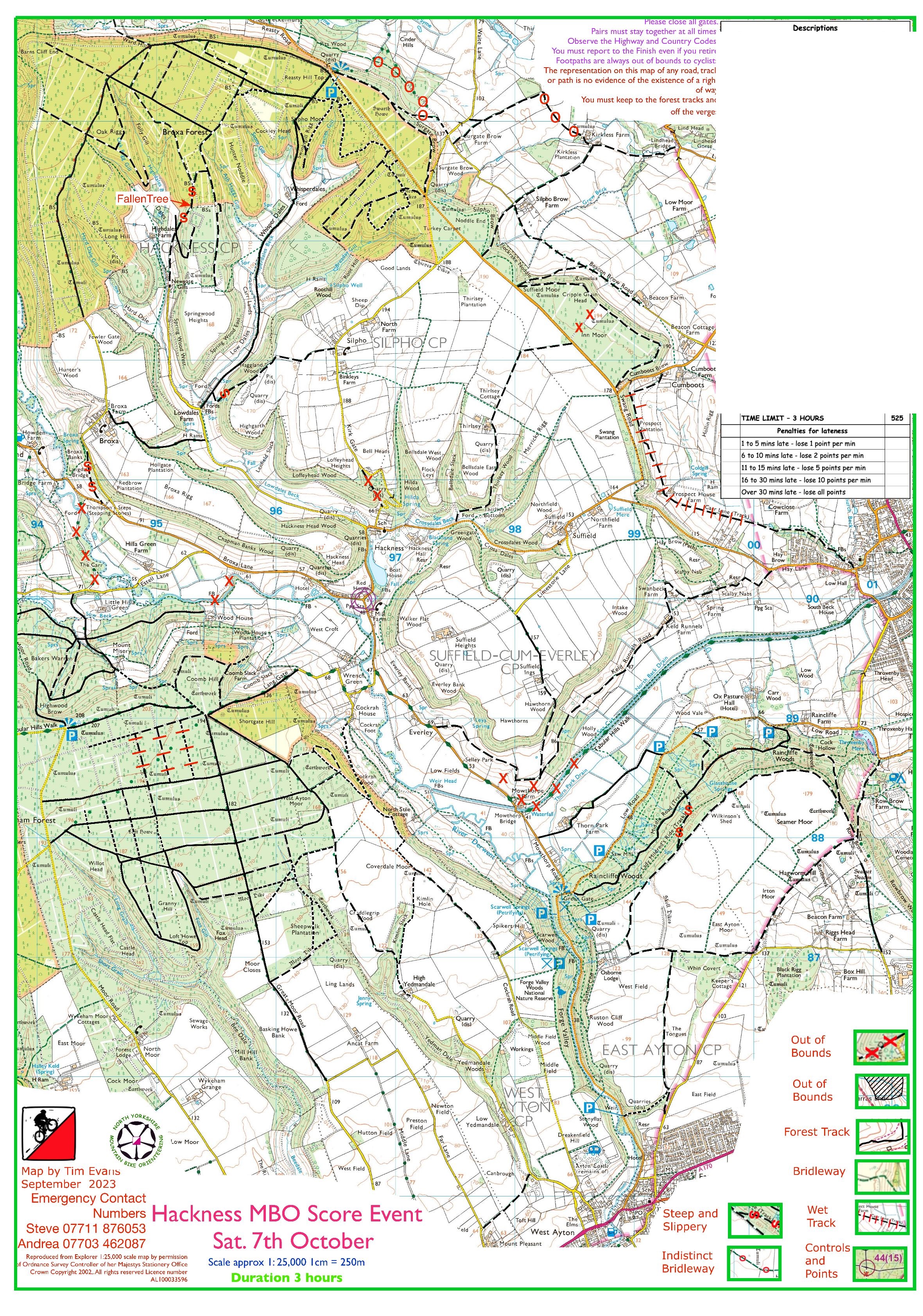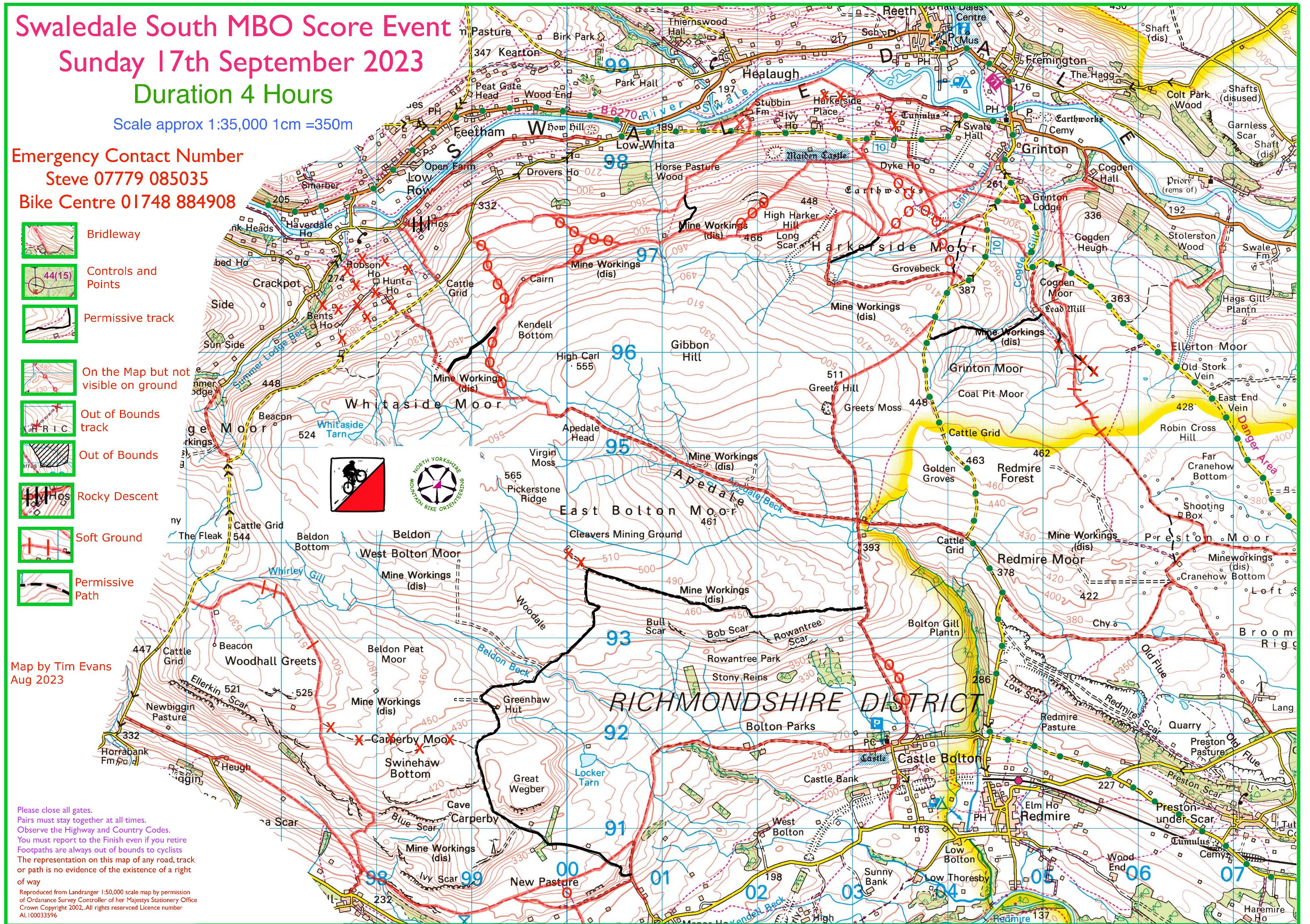 The course stayed south of the river on Sunday but the morning views didn’t look any better than on Saturday. Fortunately, the rain eased off and the wind didn’t get any stronger so I hope you could enjoy the better riding conditions. All riders (except Andy Conn) realised that they would have to ignore either the SW or SE part of the map but most decided to enjoy a stunning ride up or down Apedale and hopefully the estate track on Bolton Moor. Again the tracks had softened since my last ride so I’m sorry if they caught anyone out. I must admit I didn’t expect so many riders to use the tough bridleway between 23 and 25 so I wish I’d positioned 23 SW at the shooting hut. (Isn’t hindsight wonderful)!! Thanks to Grinton and Bolton estates for letting us use their private estate tracks. (Please remember that we have no right to use the track past Greenhaw Hut except on Sundays and never during the breeding season March to July). Thanks again to the DBC for their hospitality and the cake boxes for the weekend winners. Hopefully we’ll see you at our final event at Wykeham & Broxa Forest on Saturday 7th October. Congratulations again to the leading riders on the day and here are the full combined scores.