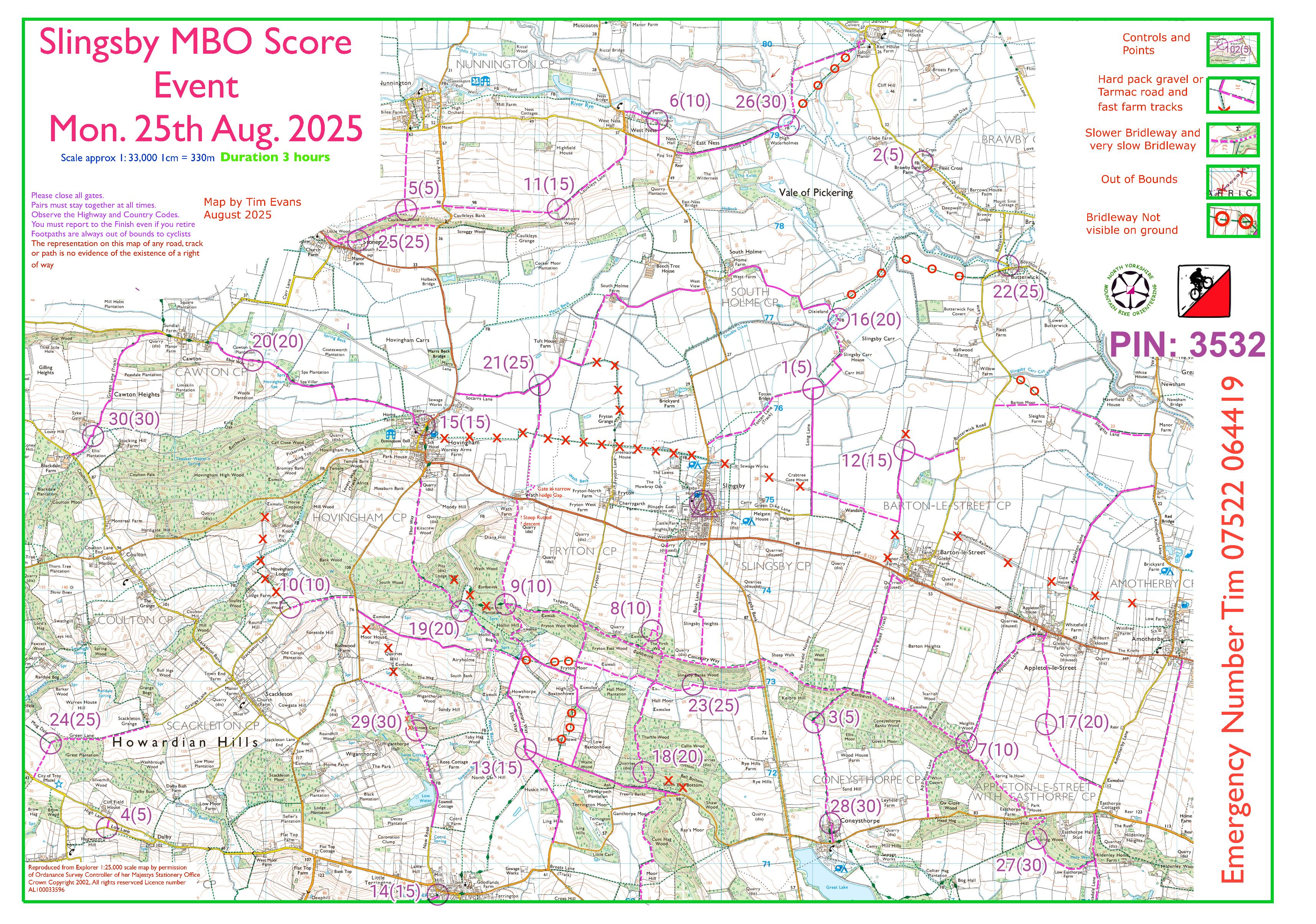 I enjoyed my two rides out testing more of the bridleways once FC had said that they didn’t have time to process our slightly late application for Dalby. I used some of the tracks from last year’s Terrington event but extended North and East to provide some variety, this was also driven by the temporary closure of the bridleway in the southwest corner for ash die back work. Hopefully I manage to avoid most of the nettles and brambles. Dave and I thought the bridleway between 3 and 28 should have been compulsory it was so good. Interesting the bridleway from 16 to 22 which was very indistinct was used by at least 2 riders, one the event winner Mr Conn as his attempt to get to control 12 was thwarted by being the wrong side of the hedge, a quick look at the tracks on maprun shows he wasn’t the only one.