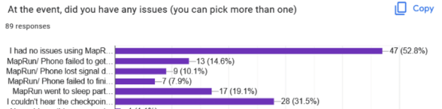 There were mainly positive responses to Installing MapRun (85.4%) and downloading the course (90.8%) – and so our main focus from the feedback is the use of MapRun during the event.